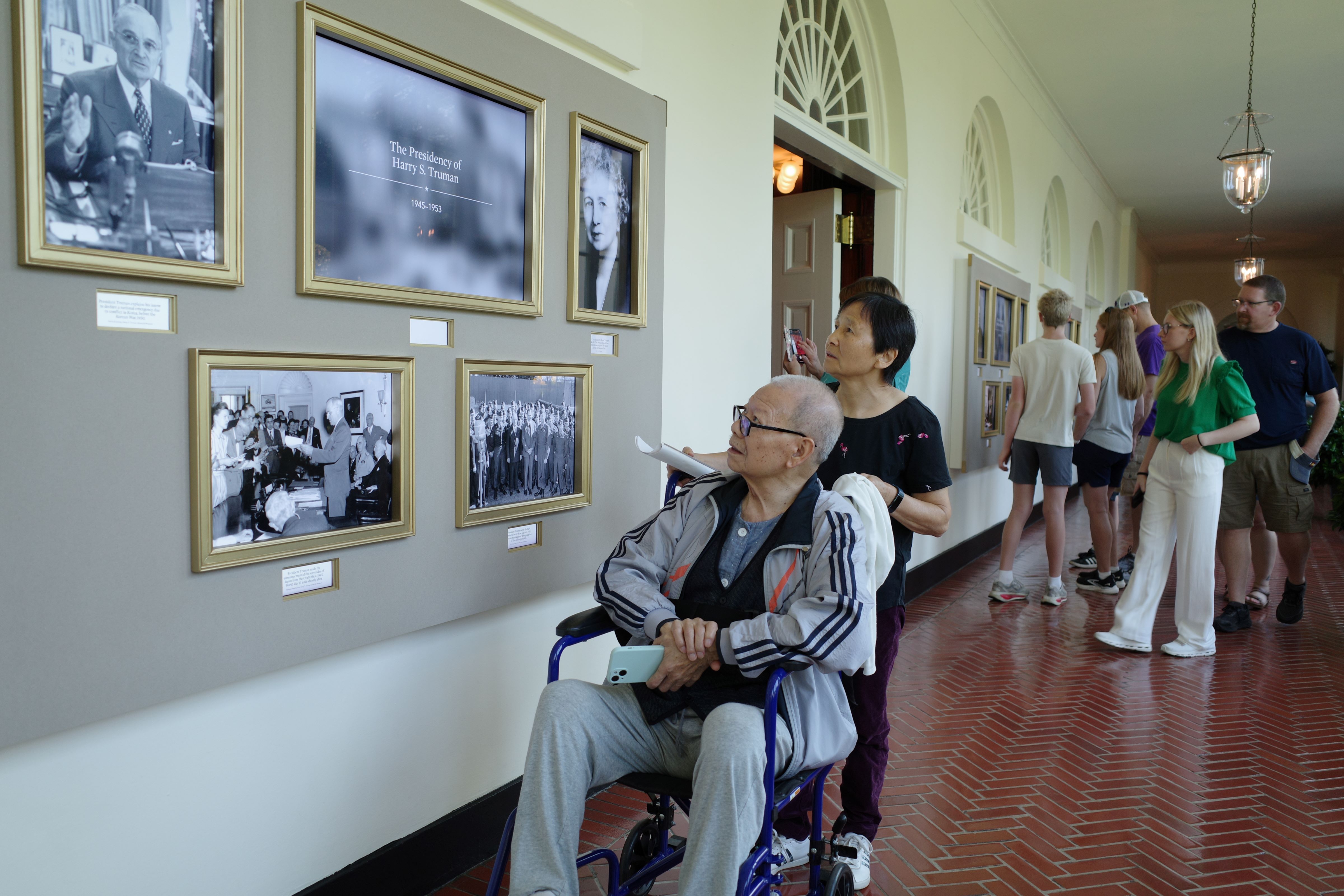 白宫开放给公众参观的是东翼,参观的第一个区域是一条走廊,踏上这条由红褐色砖铺陈的长廊似走进一条历史的时光长廊。左侧是长方形白框大窗,典型的美国民居窗户造型的扩大版,窗外便是杰奎琳∙肯尼迪花园,右侧墙上方是半圆形装饰,下方则挂着展示美国历届总统、第一夫人以及白宫重要时刻的照片。时移世异,这些看上去是普通像框的样子,实际是显示屏配上了框,这样既保留了传统相框的时光感又可以滚动展示更多图片。