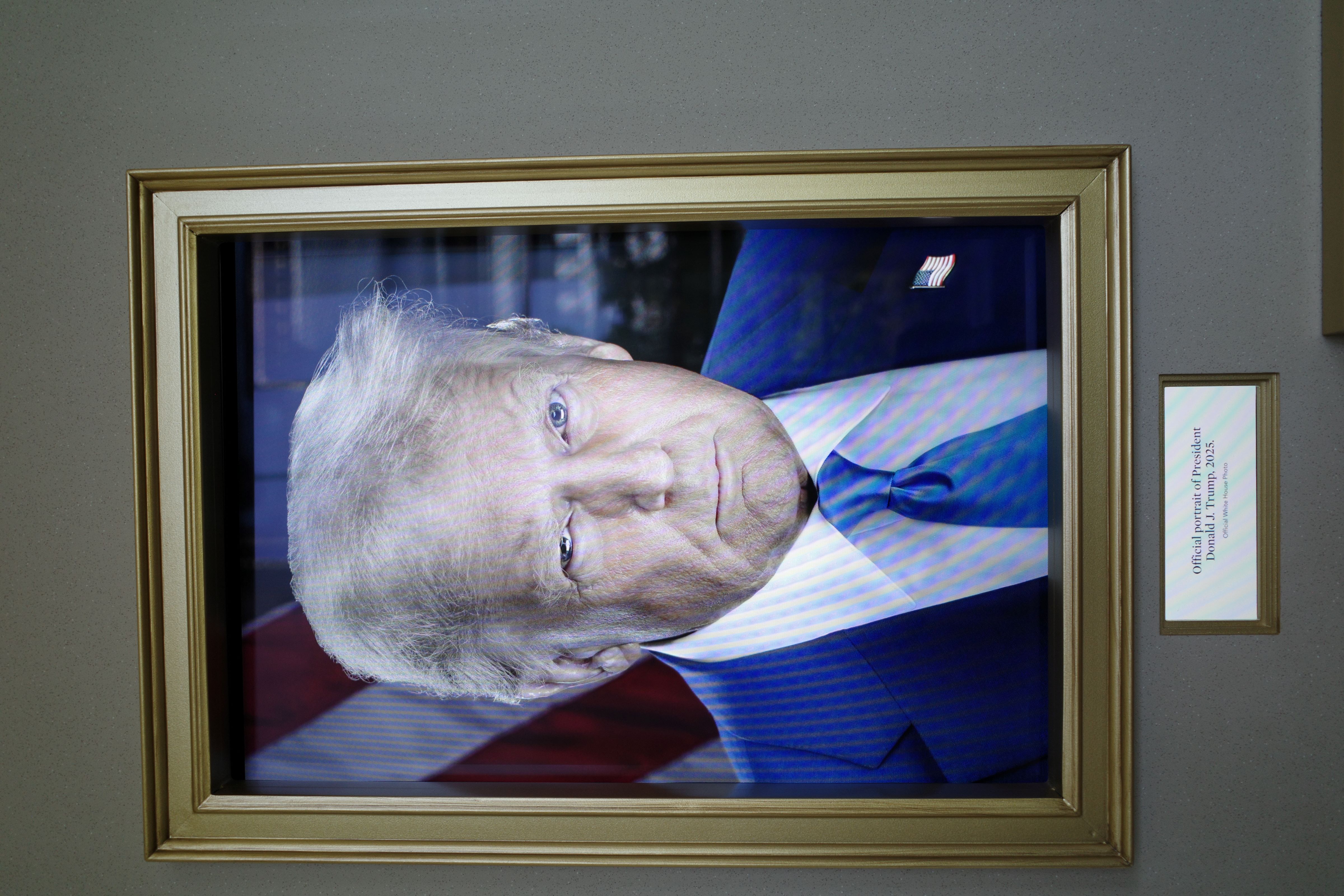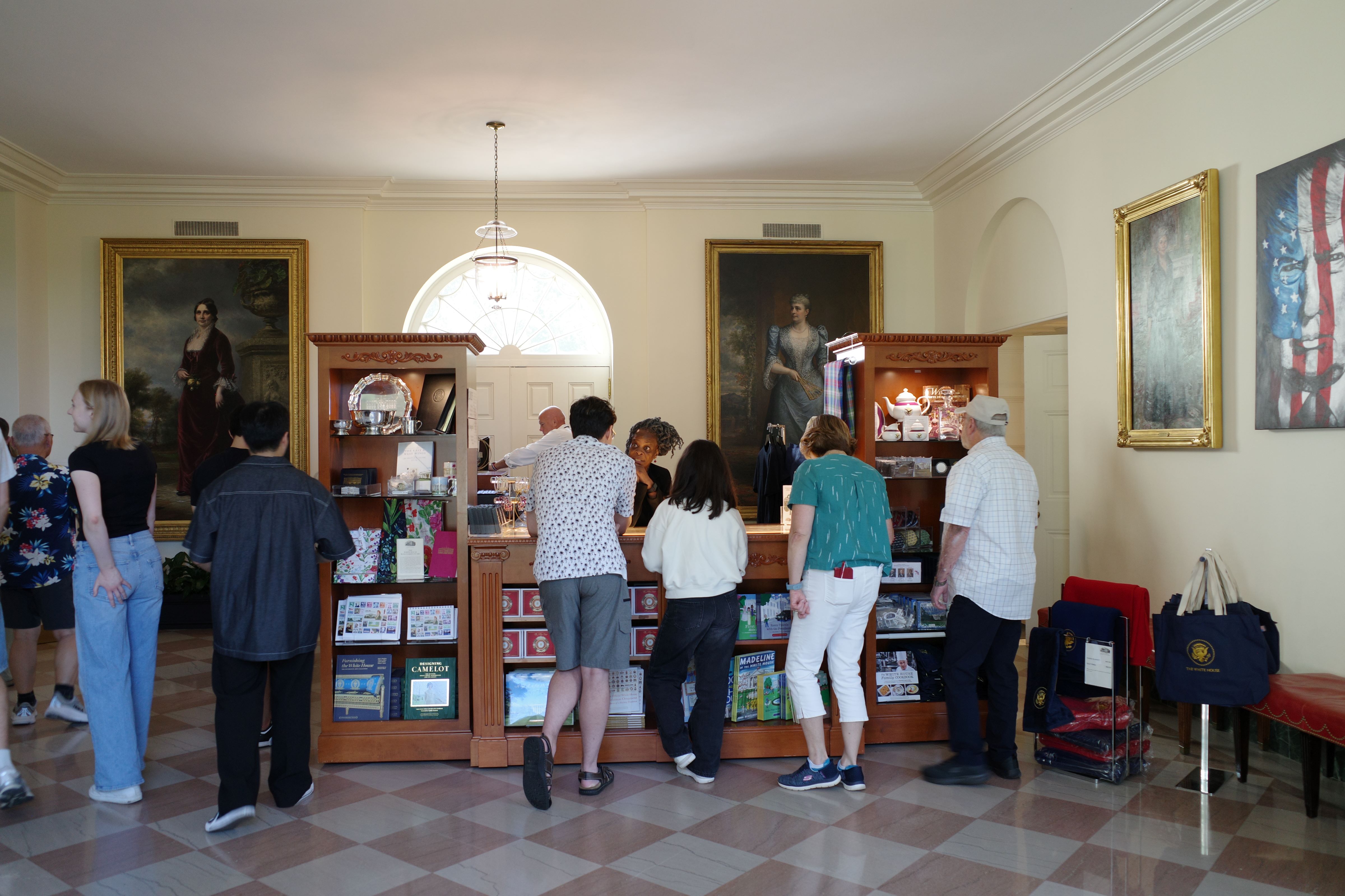 走过长廊,转角处是白宫的纪念品店,也是这一次拆除的终点。墙上的尼克松夫人和老布什夫人像之间是一张特朗普的油画,依然是表情严肃,面部覆盖美国国旗,政治意味浓烈,与两旁一坐一站两位夫人像的娴静风格形成对比。