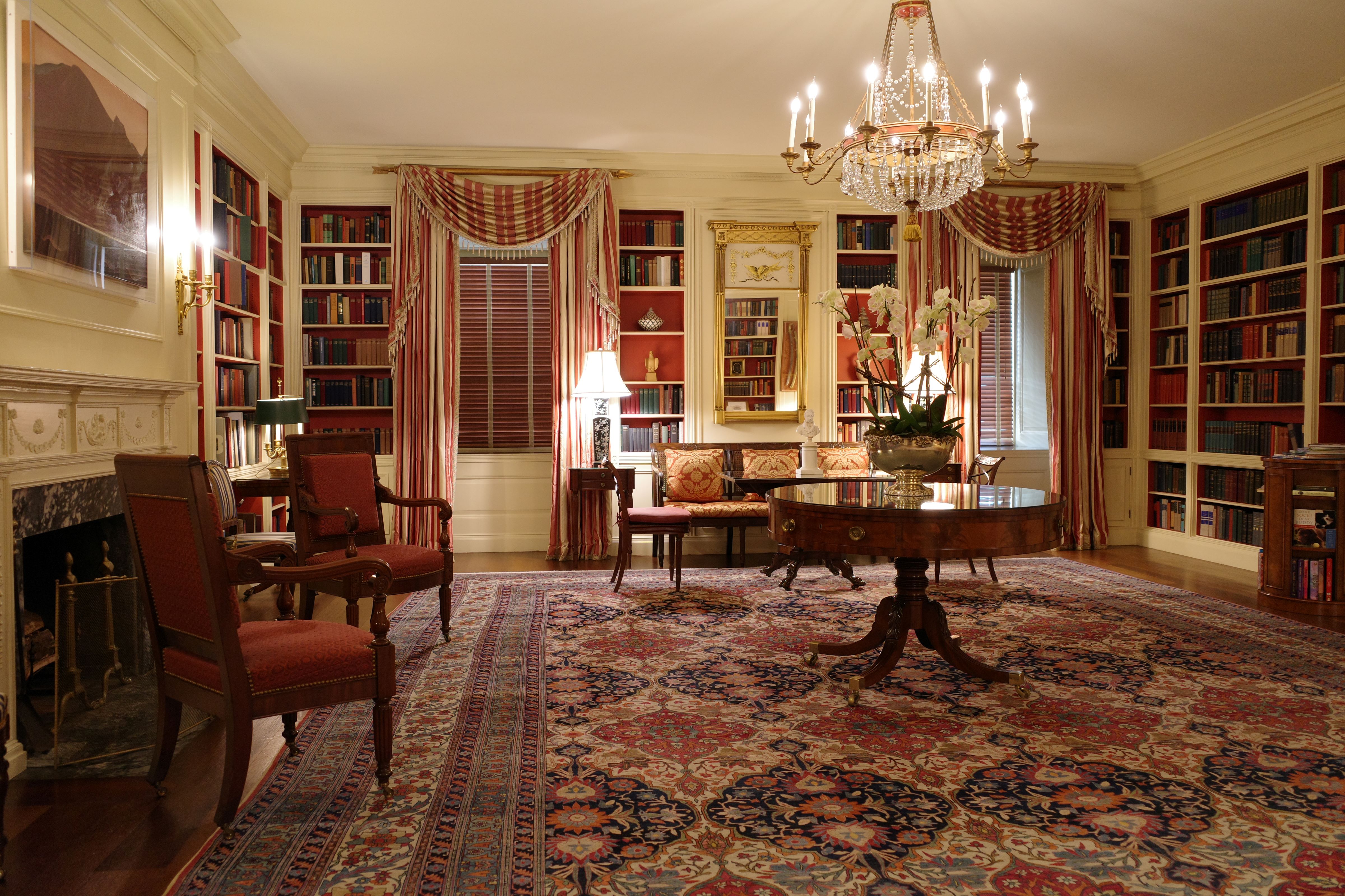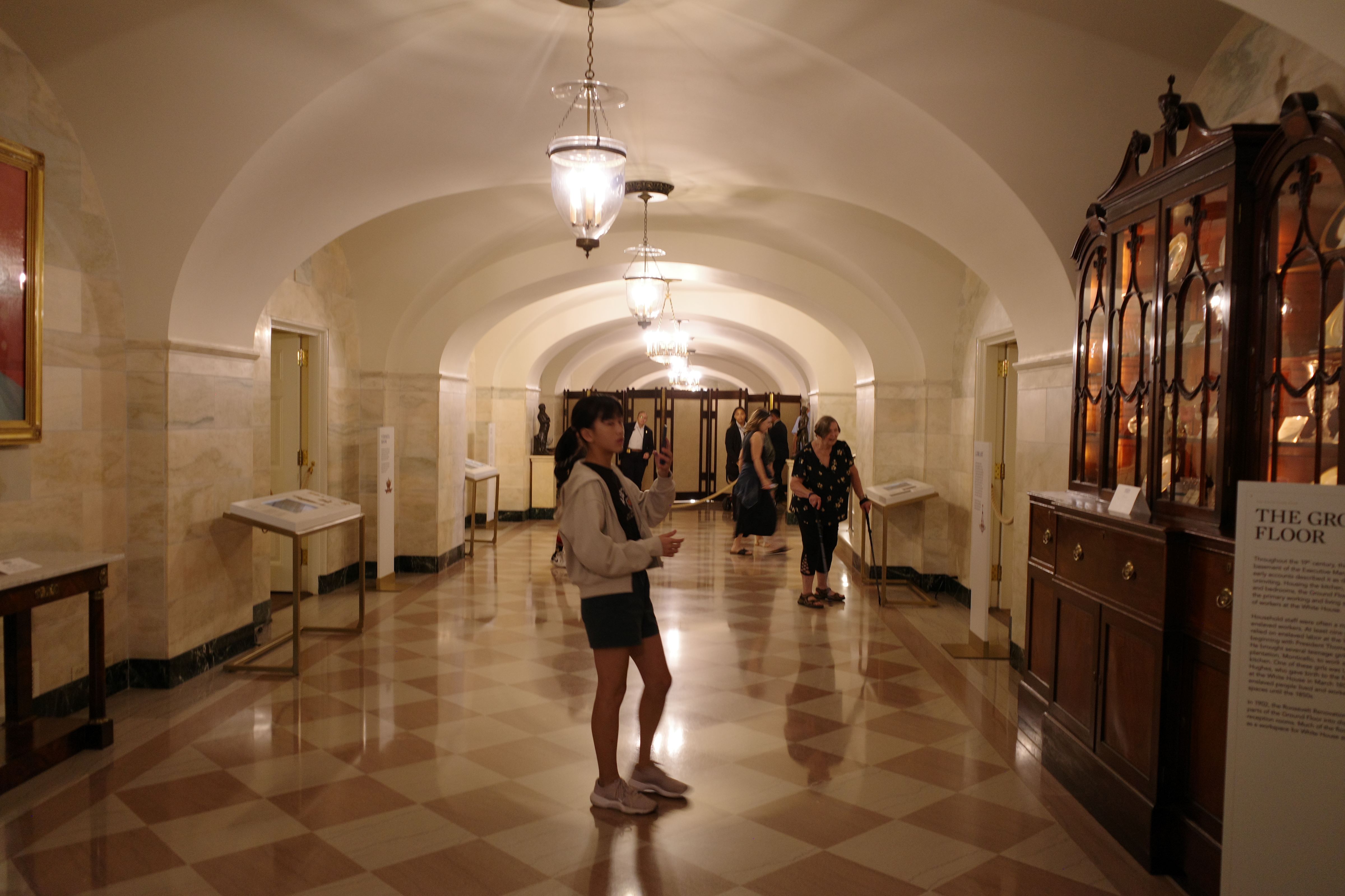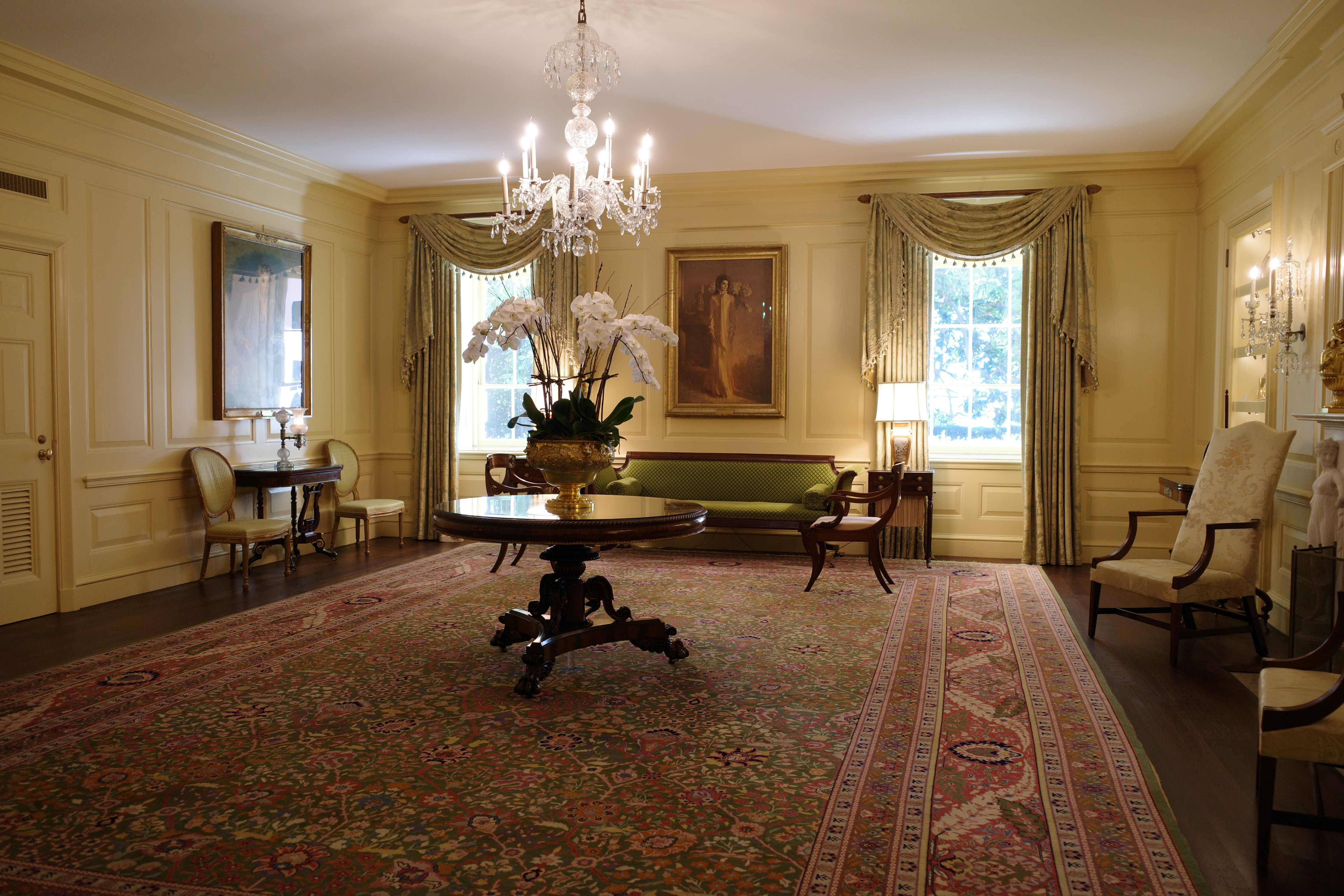 走入主楼门廊,光线略暗,门廊两侧是图书室、瓷器厅、金器厅等,大家各自在这些房间门旁驻足参观、拍照。这些房间的墙体颜色以及壁炉风格、地毯、家具摆设在历史上的不同时期都或多或少经过一些翻修或重新装饰,大多由第一夫人主持,整体结构不变但在不同的年代呈现出不同的色彩和韵味。