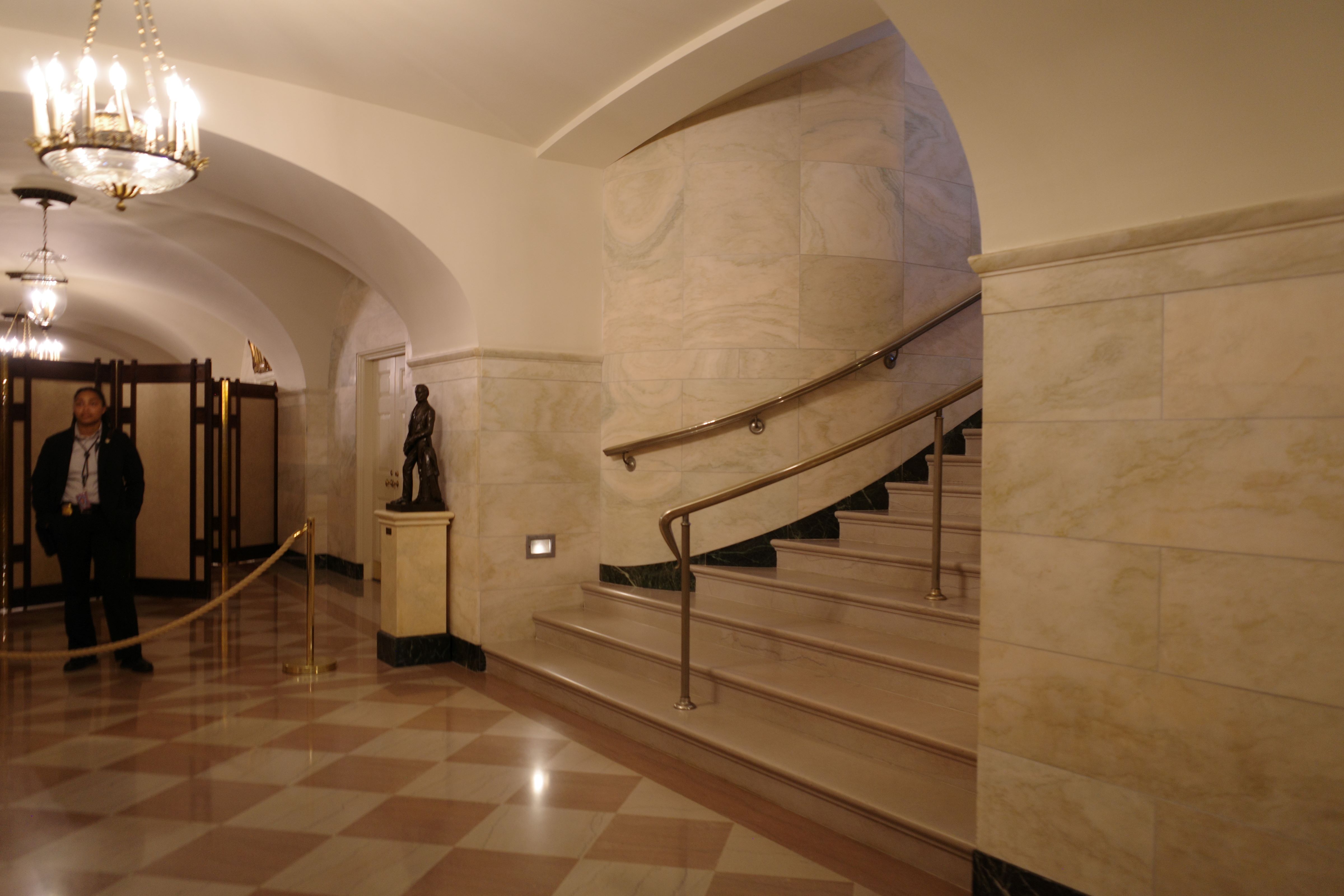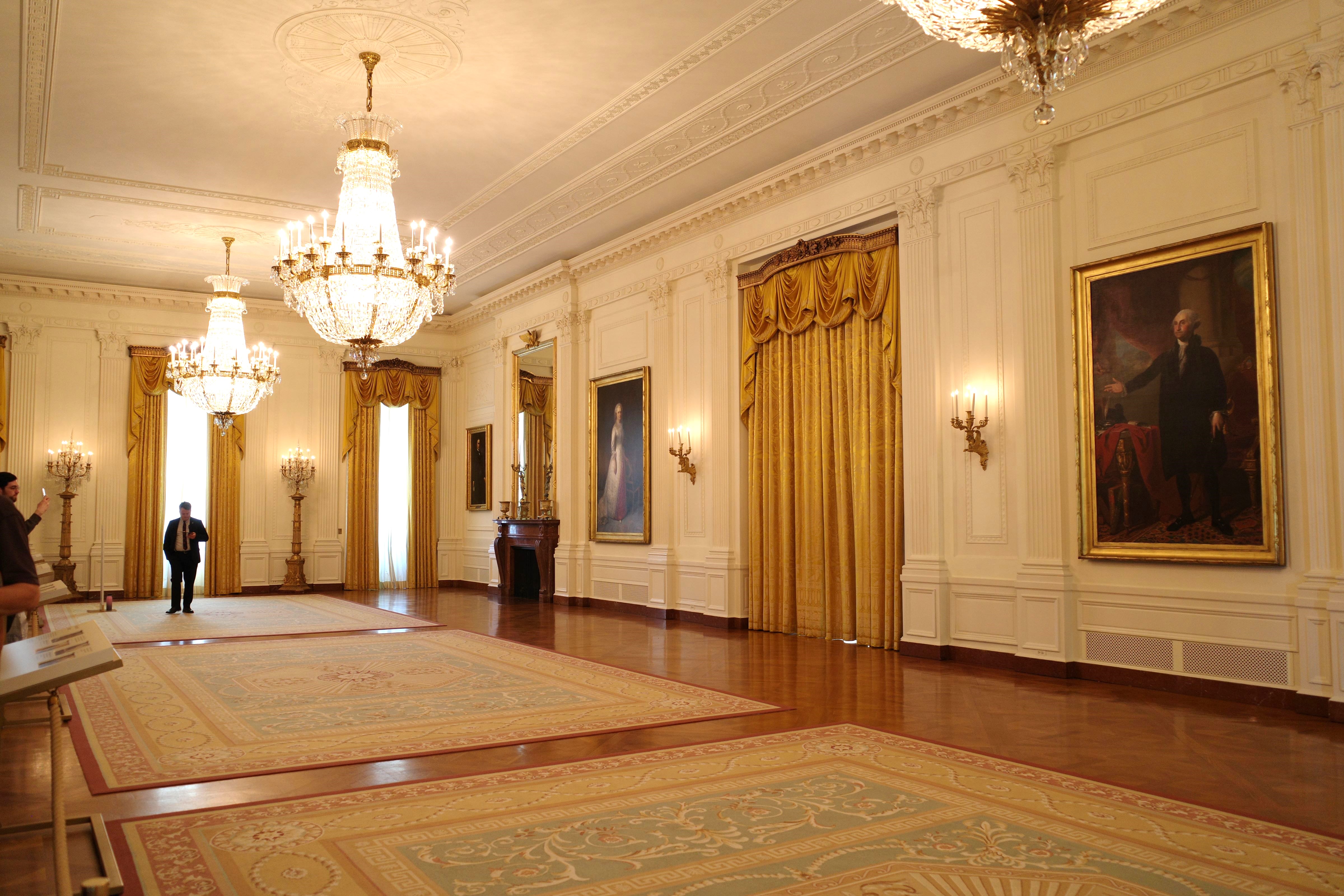 上楼后的第一个厅是东厅(East Room),这里是白宫举行重要欢迎仪式、招待会、舞会以及法案签署、政策发布的场所,许多重大历史时刻在这里定格。肯尼迪夫妇时期,常邀请艺术家在东厅演出;911事件后,小布什在东厅举行全国讲话与记者会。还在我当记者时曾经也期待能有机会到白宫采访,为自己职业生涯点上一些重彩,机缘未尽人意,曾去过卢旺达和博茨瓦纳的总统府记者会,也是人生的一些脚印。