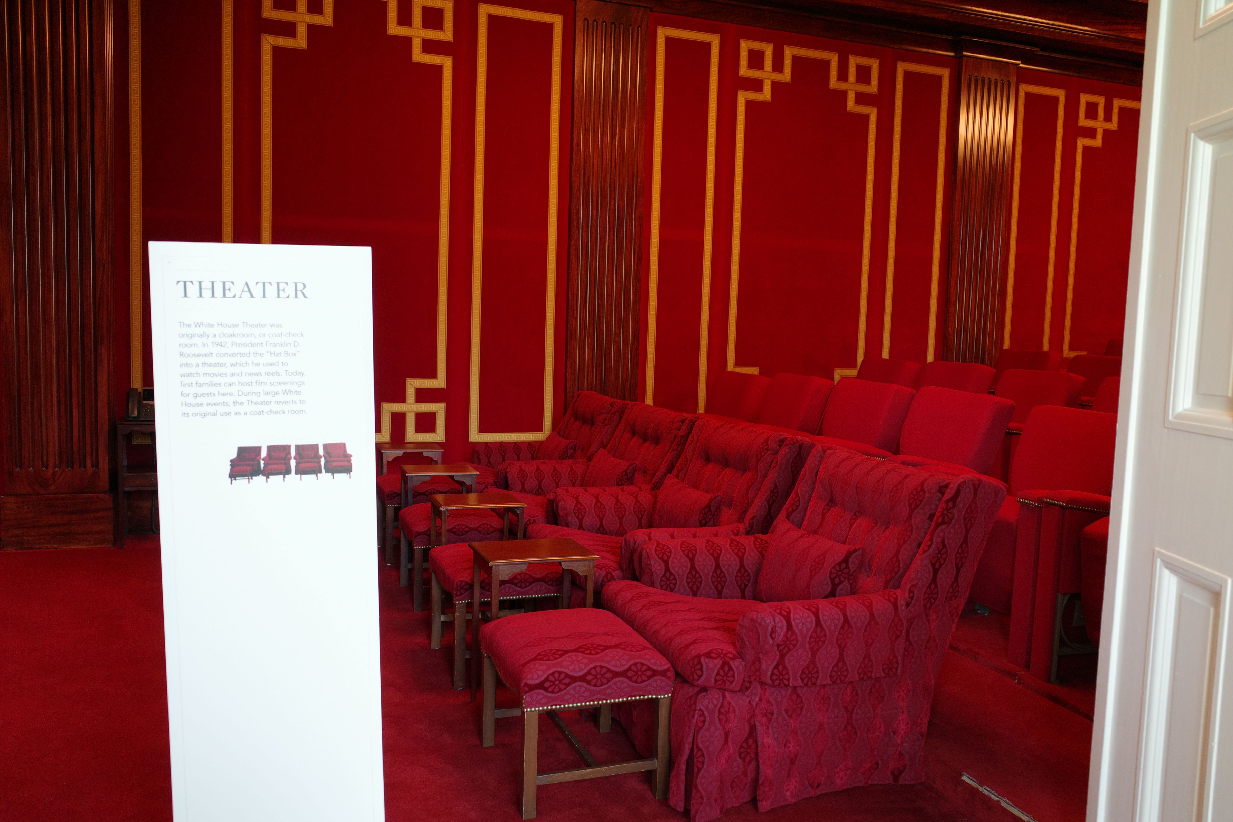 白宫的影院位于长廊中段,影院不大,仅8排座位,第一排是四个较大的沙发椅,宽大舒适,后面几排都是和普通影院一样的折叠椅,我数了数,一共可容纳46人。最早时这里是白宫的衣帽间,1942年富兰克林∙罗斯福把它改成了影院,多少风云人物曾在这里谈笑风生,如果做一个《影院轶事》一定可以出不少精彩的篇章。