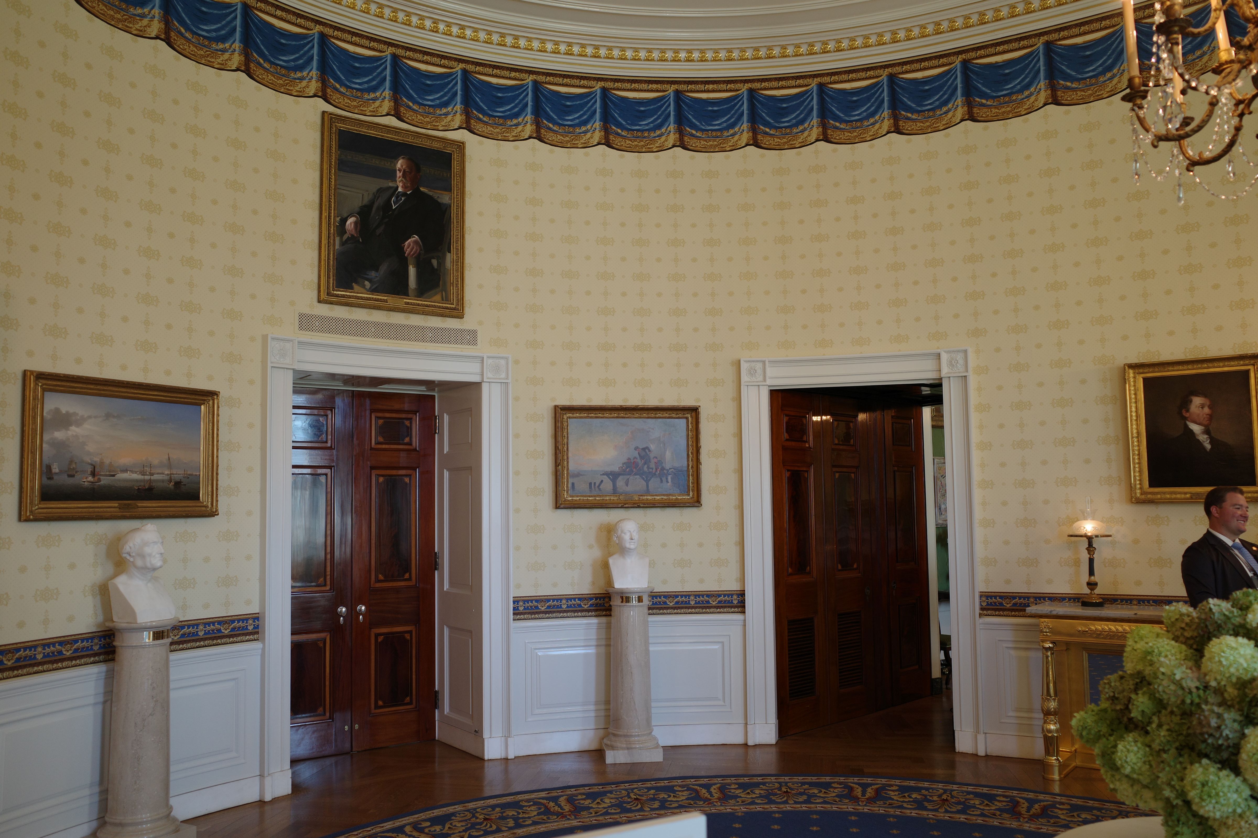绿厅和红厅各为方形,位于绿、红两厅中间的蓝厅则是椭圆形,面积稍大。在特朗普之前唯一实现非连续两个任期的总统——斯蒂芬·格罗弗·克利夫兰(Stephen Grover Cleveland)于1886年在蓝厅与弗朗西丝·福尔瑟姆(Frances Folsom)举行婚礼,斯蒂芬·格罗弗·克利夫兰是截止今天唯一在白宫举行婚礼的总统,弗郎西丝当时年仅21岁,是美国历史上最年轻的第一夫人。